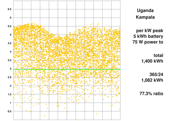 이집트 카이로에서는 지축의 경사가 장기 저장의 거의 유일한 이유입니다. 반면 우간다 캄팔레에서는 구름 덮개가 다릅니다. 총 수확량은 훨씬 적지만, 이는 더 나은 총/순 비율로 부분적으로 보상됩니다. 잘츠부르크와 비교하면 총 생산량은 55% 더 많지만 365/24 순 생산량은 131% 더 많습니다. 구성에 훨씬 더 많은 배터리가 설치되어 있고 전력 사용량은 적습니다.